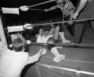 Wrestling at Will Rogers Coliseum, Fort Worth, Texas, ca. 1983-84; Kerry Von Erich [Kerry Adkisson] is seen injured in the ring with a bloodied face.