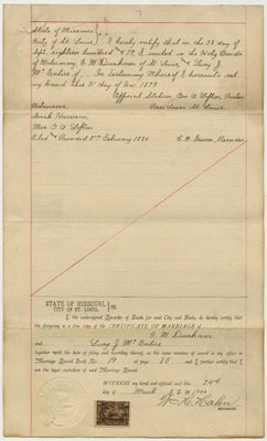 The marriage certificate of Cyrus Moore Dunham and Lucy J. McEntire.