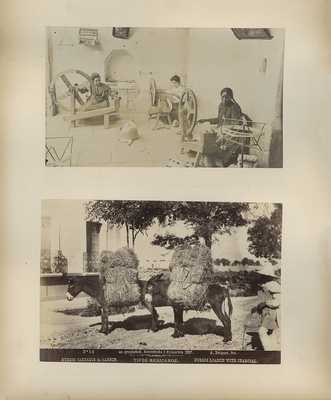 Top print is of three women operating spinning wheel machines, to make spools of thread for later use. Bottom print is of two donkeys carrying bales of hay to be sold and burned for charcoal.