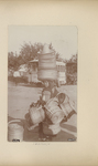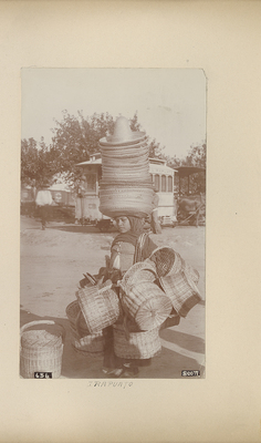 Print of a woman balancing a stack of hats on her head and baskets in her arms in Irapuato, Guanajuato.