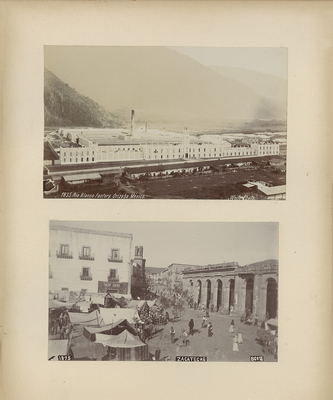 Top print is of a panoramic view of the Rio Blanco Factory in Orizaba, Mexico. Bottom prints of a Zacatecas market.