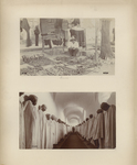 Top print is of a merchant sitting down displaying his wares in Silao, Guanajuato. Bottom print is of a church interior lined with corpses in white dress. In the center background, placed against the wall, is a corpse dressed as a priest.