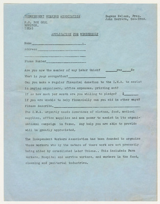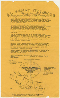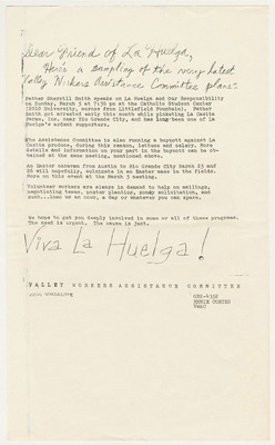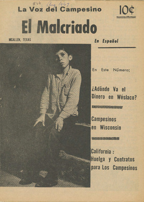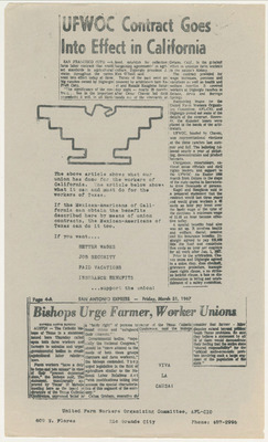 This collection consists of correspondence, newsletters, newspaper clippings, speeches, reports, map, ballots, booklets, leaflets, brochures, reprinted articles, tape recordings, photographs, and a scrapbook. Includes papers of Eugene Nelson, 1966-1967; newsletters and other materials from several groups that supported collective bargaining for farm workers; clippings and articles about the farm workers organizing movement, strikes, boycotts, living conditions, and the economic situation of farm workers in California and the Rio Grande Valley of Texas, especially Starr County, 1966-1967.