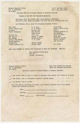 Document titled "National Boycott of Delano Grapes & Schenley Products". Listed are Schenley labels to not purchase in support of the boycott.