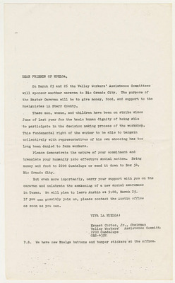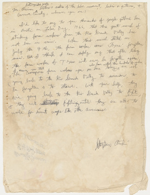 Written speech for participants of the Rio Grande Valley farm worker march. The location of the speech is stated to be Austin, Texas.