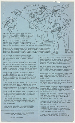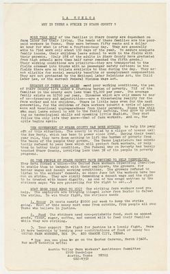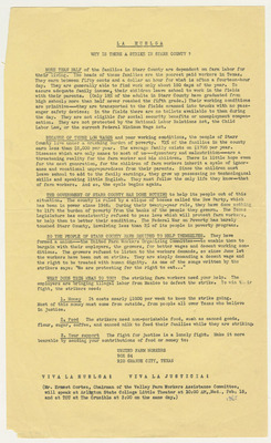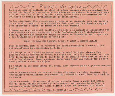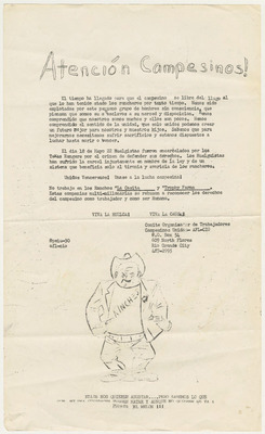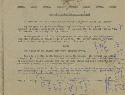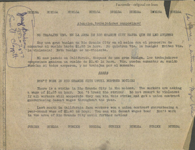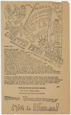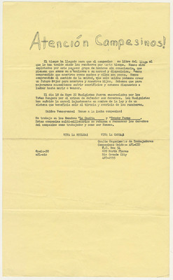 Flyer in Spanish from the United Farm Workers Organizing Committee stating that "The time has come for farm workers to acquire freedom from ranchers that have exploited them for years. The document also states that on May 18, 22 protesters were arrested by the Texas Rangers for the crime of defending their own rights.