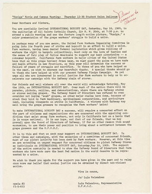 Invitation to the International Boycott Day, Saturday, May 10, 1969. The event would take place in the auditorium of All Saints Catholic Church and would be featuring the movie titled "Huelga".
