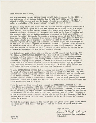 Invitation to the International Boycott Day, Saturday, May 10, 1969. Support from the community is requested and help with boycotting Safeway.