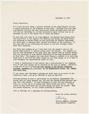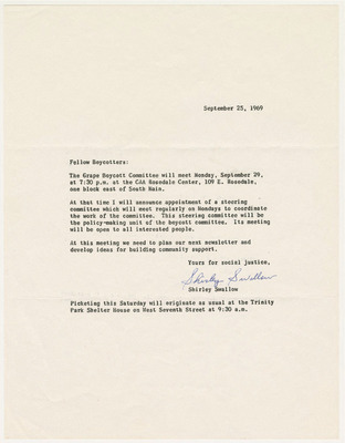 Correspondence from Shirley Shallow to members of the Grape Boycott Committee dated to September 25,1969.