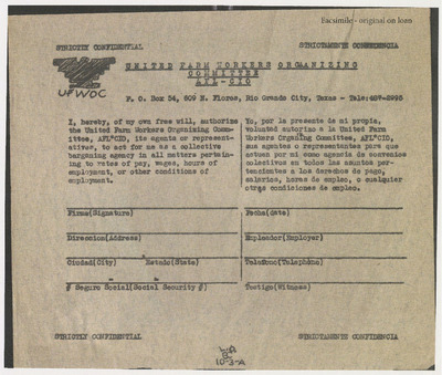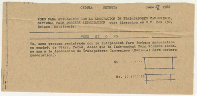 Voting document for the United Farm Workers Organizing Committee for members of the union.