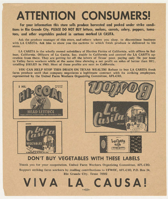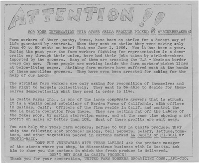Document stating that the products sold at the store are produce picked by strikebreakers. It is also stated that to support Texas farm workers, refuse to buy La Casita produce.