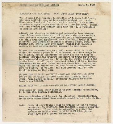 Document from the Farm Workers Association of Delano, California, requesting help with their strike.
