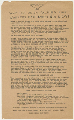 Flyer titled " Why do packing shed workers shed workers earn $40-100 a day?". The document also informs farm workers of the Federl Law called the National Labor Relations.