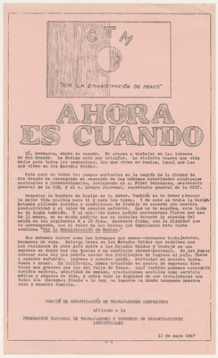 Document by the United Farm Workers Organizing Committee titled "Ahora es cuando" telling farm workers from Mexico to not cross over the Rio Grande to work because the victory is near.
