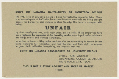 Document titled "Don't buy La Casita cantaloupes or honeydew melons" that states that employees who are on strike with the union, have been replaced by non-union strike breaking workers.