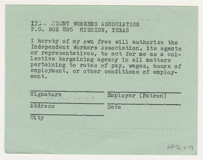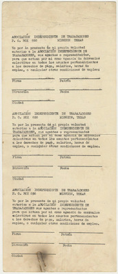 Document in Spanish relating to the Independent Workers Association in Mission, Texas. The document authorizes the organization to represent and speak on behalf of the rights and working conditions of workers.