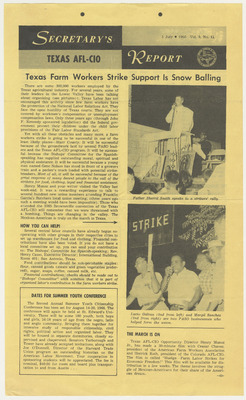 Document titled "Secretary's Report on Texas AFL-CIO. Pictured is Father Sherril as he speaks at strikers rally.