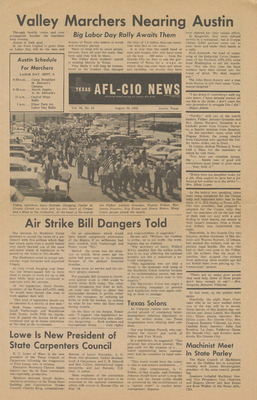 Article from the Texas AFL-CIO News titled "Valley marchers nearing Austin". The article is dated August 20, 1966, and it states updates on the Valley farm workers' march across Texas.