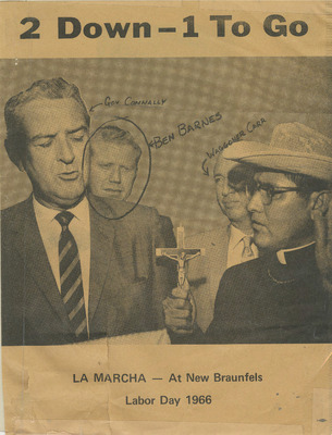 Flyer titled "2 Down - 1 To Go" that pictures marchers of "La Marcha" meeting, from left to right, John Connally, Texas Governor, Ben Barnes, speaker of the Texas house of representatives, and Vincent Waggoner Carr Attorney General of Texas. The meeting took place at New Braunfels, Texas during labor day, 1966. In the back is pictured Texas Ranger Captain Alfred Young Allee.