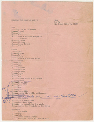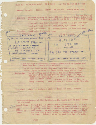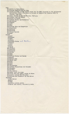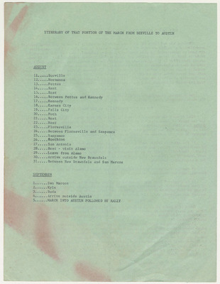 Itinerary for the farm worker's march from the portion of the march including Beeville to Austin. On the back are details regarding hospitality for the march participants.