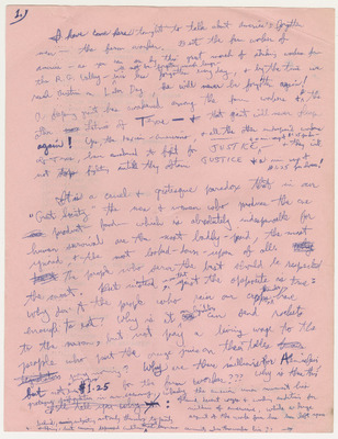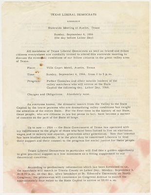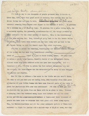 Written speech about farm workers that was delivered on labor day, 1966 at Austin, Texas.