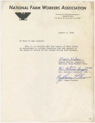 Correspondence from the National Farm Workers Association to "whom it may concern". The letter states that its purpose is to certify that the bearer of the letter is authorized to solicit donations for support of the march to Austin of Rio Grande Valley farm workers.