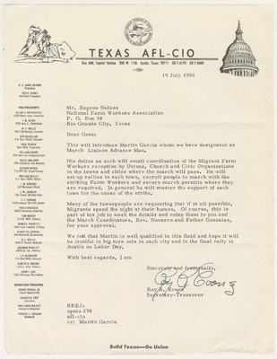 Correspondence from Roy R. Evans, secretary treasurer of the Texas AFL-CIO, to Eugene Nelson from the National Farm Workers Association.