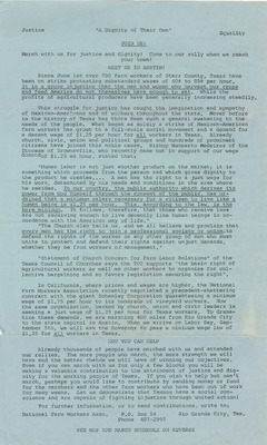 Document titled "A Dignity of their own" promoting a march at Austin to protest for the rights of farmworkers. The document also states how the public can help support the march.