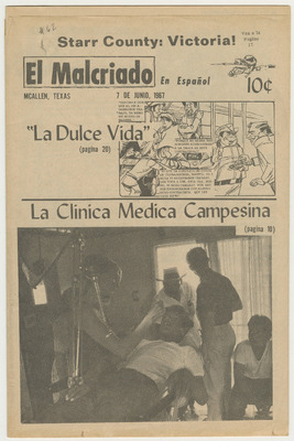 "El Malcriado" newspaper May 24, 1967 edition. The newspaper states updates on new objectives of the union and also on "the fight to save Texas". The document also includes a history portion about the fight for textile workers in the 19th and 20th century for better working conditions.