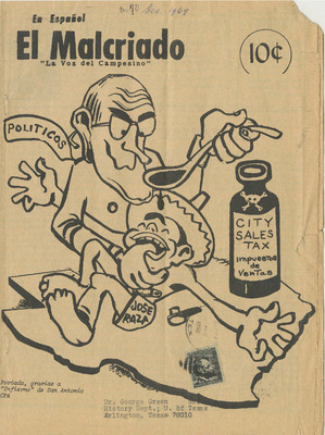 "El Malcriado" newspaper December, 1967 edition. The newspaper contains information for farm workers along with featuring a section dedicated to Cesar Chavez.