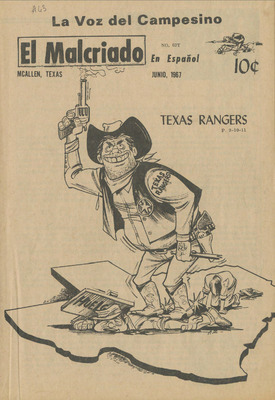 "El Malcriado" newspaper from June, 1967 edition. The newspaper reports on the arrest of 19 people on May 26 by the Texas Rangers.