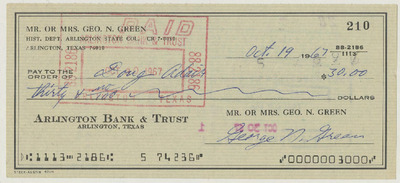 Bank check stating pay to the order of "Doug Adair" the amount of 30,000. The check is signed by "George N. Green" from the History Department Arlington State College. The check is dated October 19, 1967.