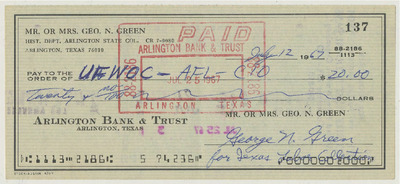 Bank check stating pay to the order of "UFWOC-AFL-CIO" the amount of 20,000. The check is signed by "George N. Green" from the History Department Arlington State College. The check is dated July 12, 1967.
