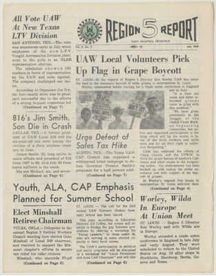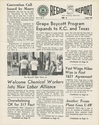 "Region 5 Report" from the United Auto Workers newsletter dated August, 1969. The document contains news from region 5 such as " Grape boycott program expands to Kansas City and Texas".