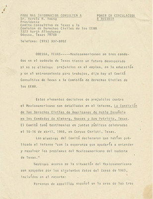 Document in Spanish from Harold H. Young, president of the Texas Advisory Committee to the United States Commission on Civil Rights.