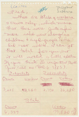 Note containing numbers of workers and crew members interstate and intrastate migrant workers.