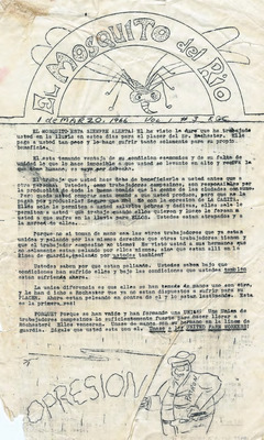 Flyer titled "El Mosquito del Rio" which encourages farm workers to join the United Farm Workers Organization.