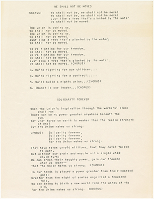 Grape Boycott strike lyrics, "We Shall Not Be Moved" and "Solidarity Forever," ca. 1966-1969.
