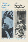Booklet titled "Right to Work" by Cesar E. Chavez and Bayard Rustin. The document is in English and Spanish and states the injustice affecting "America's minorities".