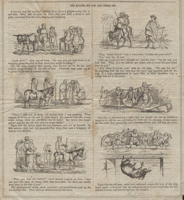 A newspaper sheet featuring an illustrated story depicting 2 men and a mule. The backside has more written stories and articles.