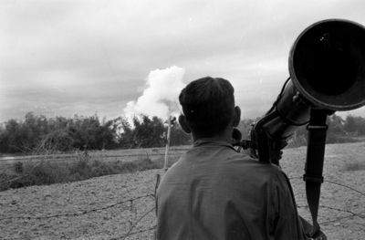 Back view of unidentified soldier holding missile launcher on his shoulder in field.
