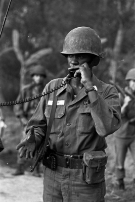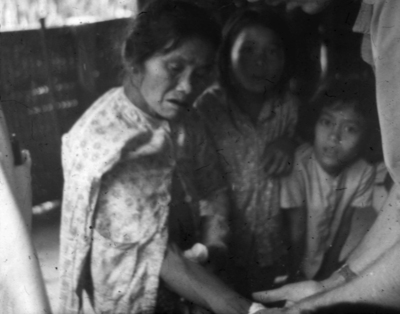 Unidentified soldier in village in Vietnam. With him is an unidentified woman with children.