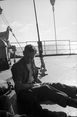 Unidentified photographer sitting down with and talking to unidentified soldier. They are holding cigarettes.