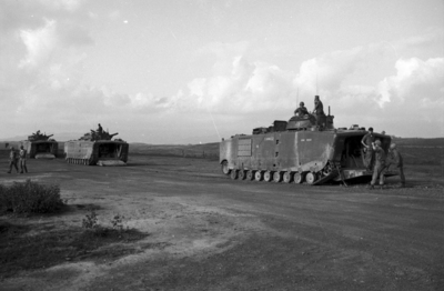 Unknown soldier aiming missile launcher on his shoulder. Two more soldiers stand near him.