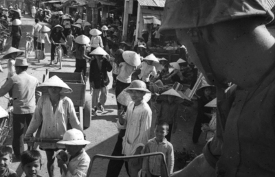 Five year old Vietnamese girl, her face still streaked with tears of fright brought on by the sounds of guns, peeks from behind her mother as Marines march into Vietnamese hamlet.