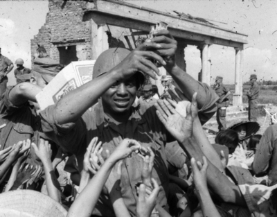 Unidentified soldier in village holding up food while hands reach towards.it.
