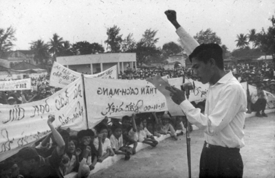 Public speaker on stage with fist raised in the air while reading from paper. A large crowd is in front of him.