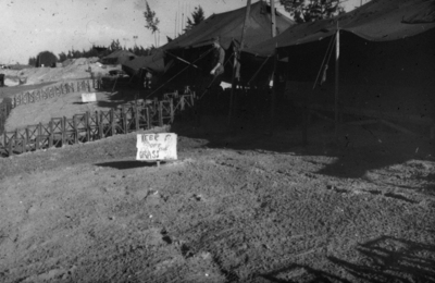 Unidentified soldier walking towards more soldiers standing by pile of hay.