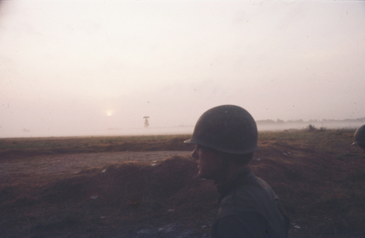 Unidentified soldiers walking in field. One is looking down at map with pen in hand.