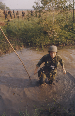 Bob Schieffer wading through river. Soldiers are walking towards river in the background.